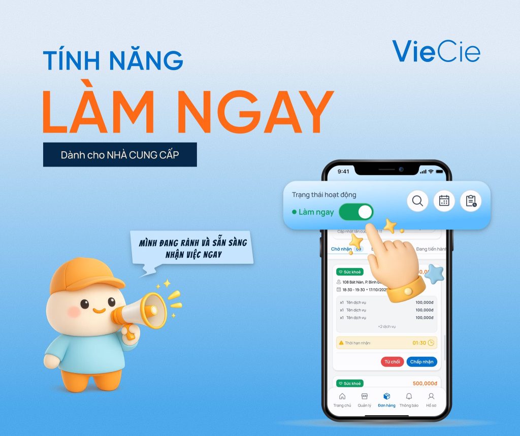 Bạn là người cung cấp dịch vụ và đang có thời gian rảnh? Đừng để thời gian trôi qua lãng phí! VieCie mang đến tính năng đột phá dành riêng cho bạn: LÀM NGAY.